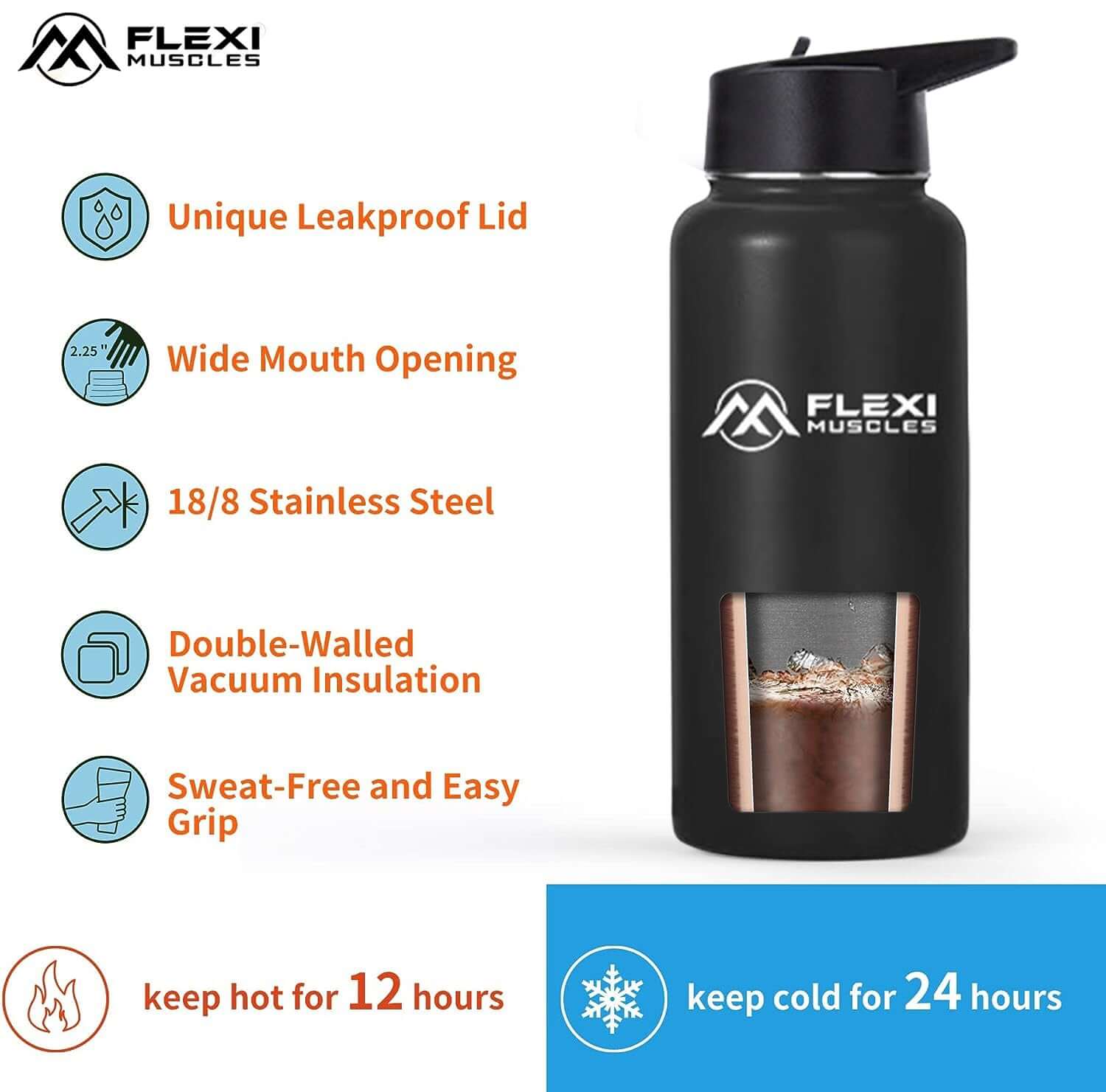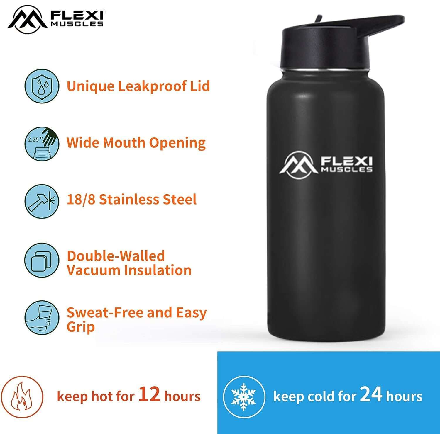 Sleek & Stylish Design - Flexi Muscles reusable water bottle combines function with fashion. It’s the perfect accessory to complement your active lifestyle, whether you’re at the gym, in the office, or on the go.