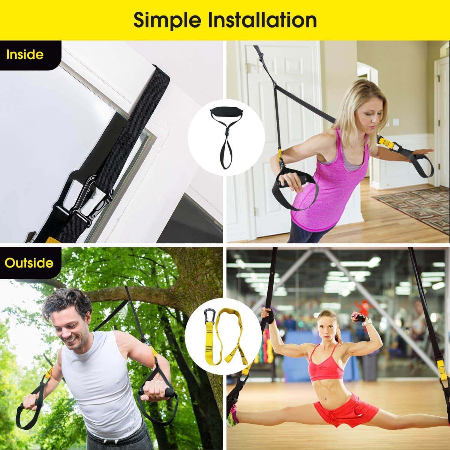 HIGH QUALITY COMFORTABLE STRAPS – Our suspension trainer is built from adjustable resistant straps of thick webbing, comfortable non-slip rubber handles and padded foot cradles, indexed extension straps to tailor resistance, and integrated foam door anchors that won’t damage your door and a travel bag for quick storage. High-grade carabiners for quick change to gym ring and more allows for more possibilities.